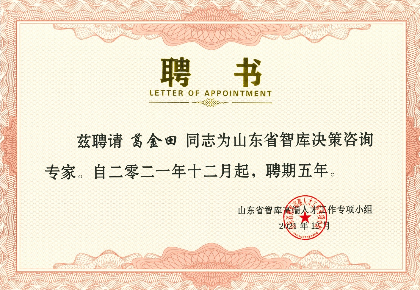 近日,接山东省智库高端人才工作专项小组办公室通知,标准化产业公司经理葛金田教授被续聘为山东省智库决策咨询专家,聘期自2021年12月算起,为期五年。