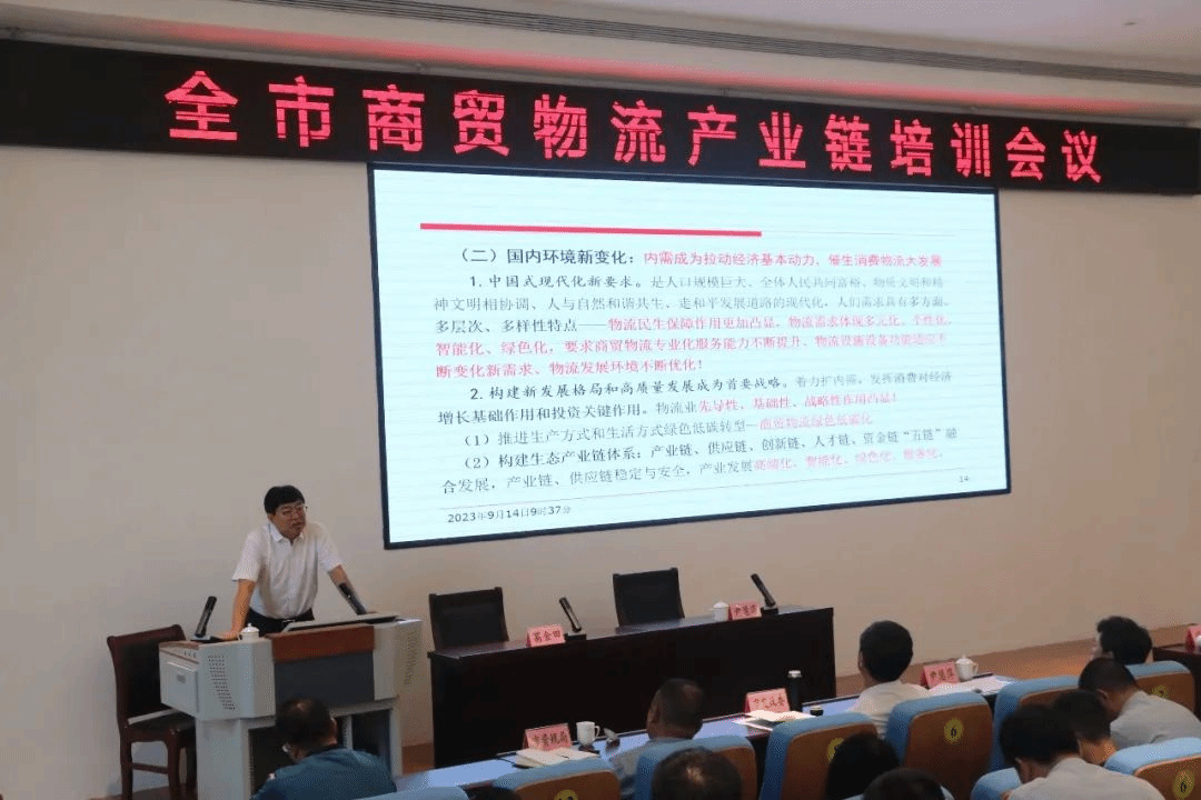 会议邀请公司博士生导师、山东物流发展研究中心主任、山东省决策咨询委员会专家库首批专家葛金田教授授课。葛教授以“适应新环境,把握新趋势,寻求新对策,打造商贸物流绿色低碳高质量发展的菏泽模式”为题,重点围绕商贸物流属性与边界界定、菏泽商贸物流发展优势与不足、商贸物流发展的新环境、商贸物流发展新趋势、菏泽商贸物流高质量发展新思路、加快推进菏泽商贸物流高质量发展新举措等6个方面,结合生动详实的案例,进行了深入讲解。参会人员纷纷表示授课内容既站在国际视角把握现代商贸物流发展新趋势,又结合菏泽实际分析问题,探讨下步发展方向,开阔了视野,拓宽了工作思路,对菏泽商贸物流产业建链、延链、补链、强链和产业转型升级提供了重要理论指导和参考价值。