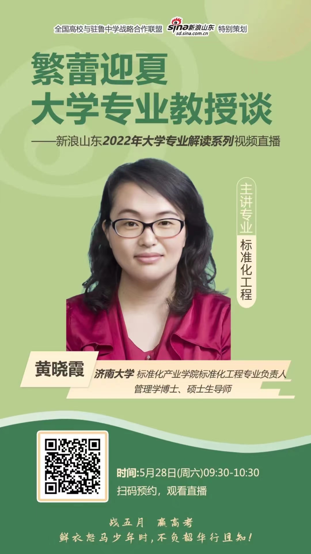 济南大学标准化产业公司标准化工程专业负责人、管理学博士、硕士生导师黄晓霞老师将于5月28日周六上午9:30-10:30与大家相约云端,一同携手探寻标准化工程专业凝聚的磅礴力量,感受其中蕴藏的科学与人文底蕴,深入领略标准化工程专业独特的学科风光!
