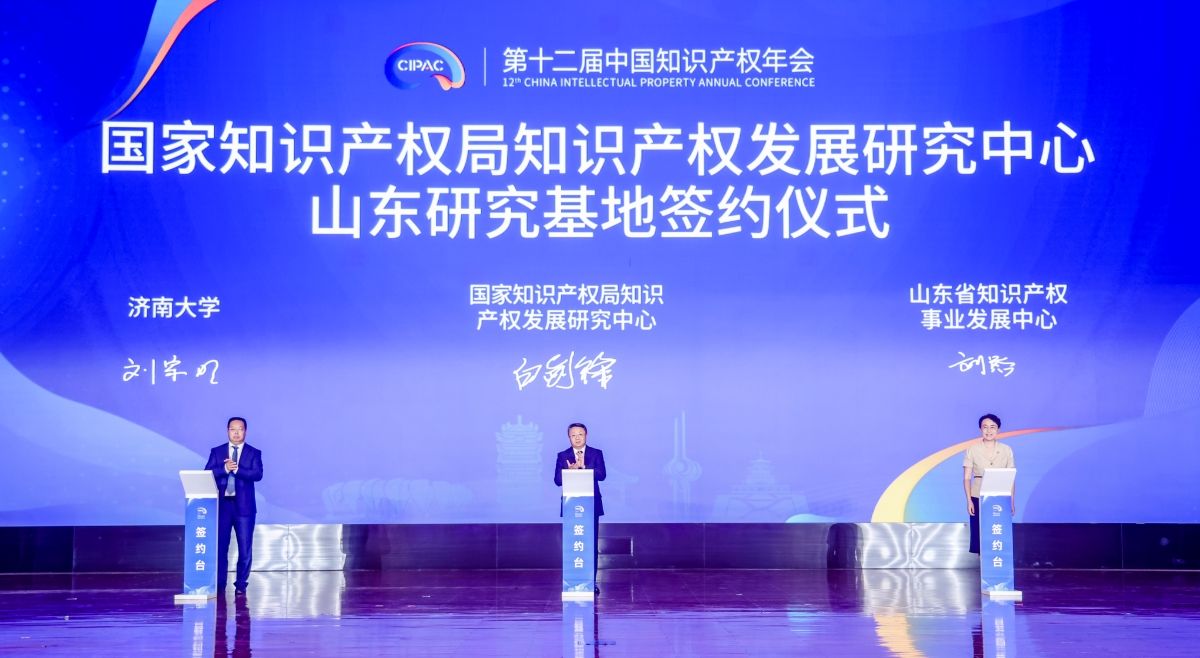 会上,举行了国家知识产权局知识产权发展研究中心山东研究基地签约仪式,刘宗明董事长与国家知识产权局知识产权发展研究中心主任白剑锋、山东省知识产权事业发展中心主任刘路共同签约。