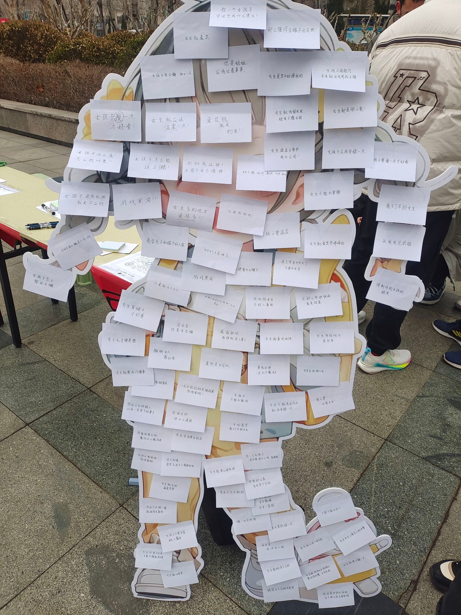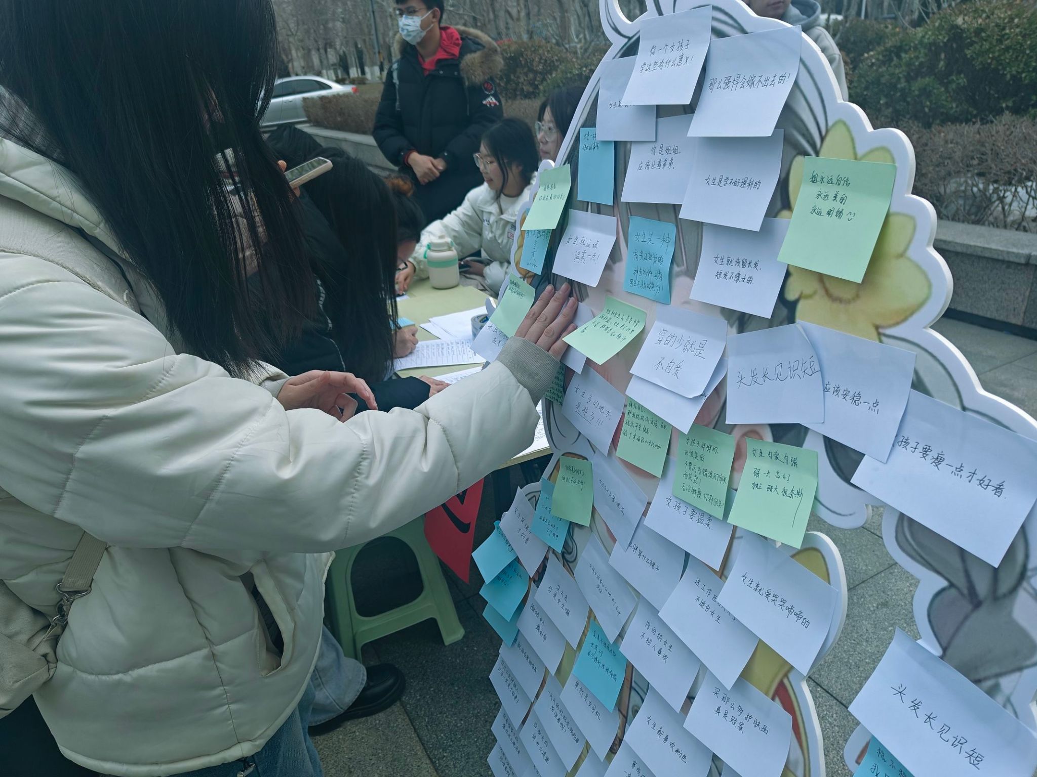 活动处有一面小女孩立牌,上面贴着普通人对于女生的刻板印象白色便利贴,参加活动的同学则需要撕下那些对女生的偏见,并在彩色便利贴上写下内心对于女生真挚的鼓励。活动现场场面热闹,同学们云集于此,纷纷用纸笔书写下内心的祝愿。