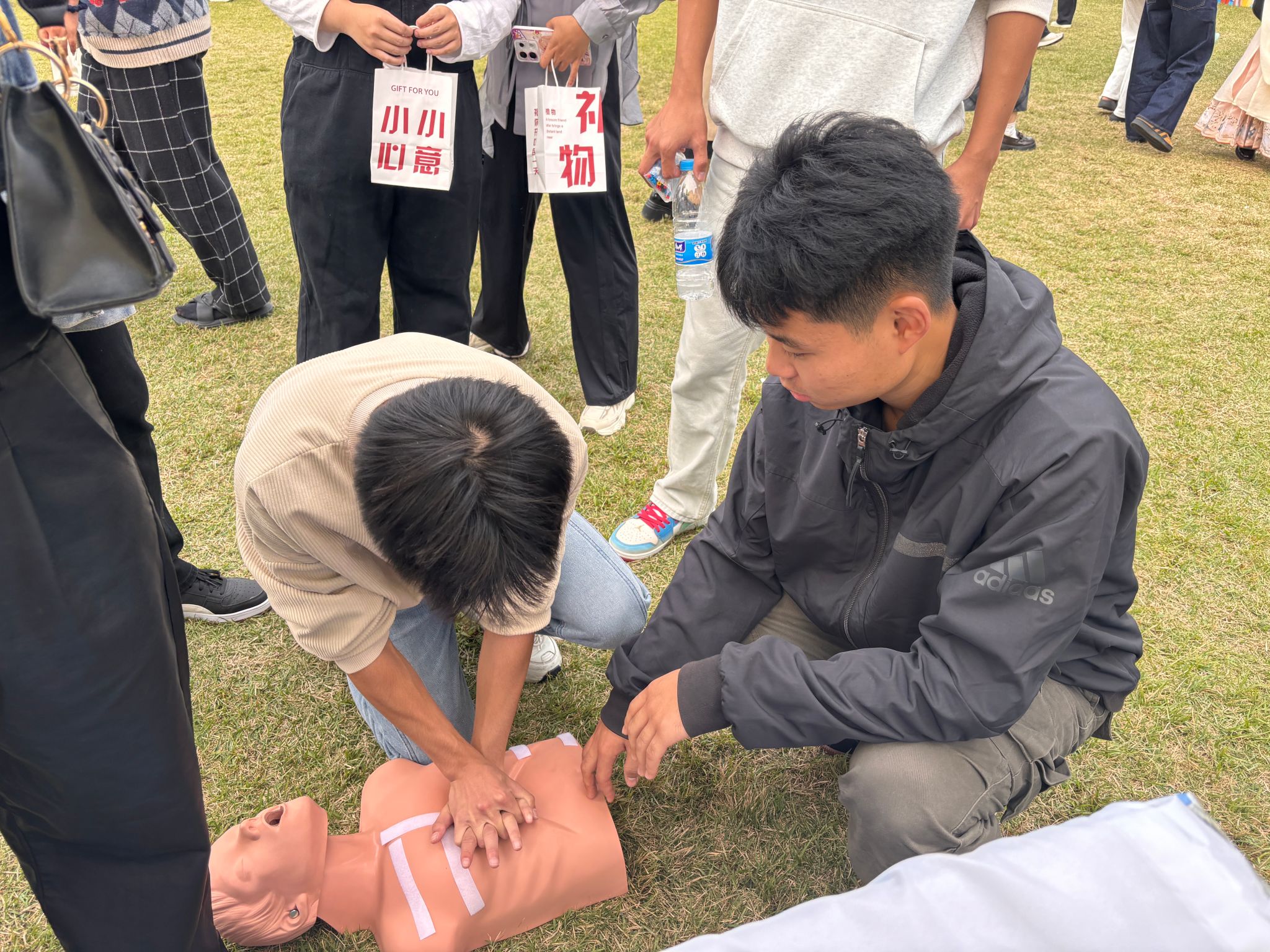 为了让急救知识更加贴近员工生活,益救应急协会设立了“急救地摊”。在这里,经过红十字培训的社团成员化身“急救达人”,通过互动体验、实操演练等形式,向过往师生传授心肺复苏、AED使用等基础急救技能。通过模拟实操,让大家在轻松愉快的氛围中掌握关键时刻能救命的急救技巧,共同传递生命的温暖与力量。