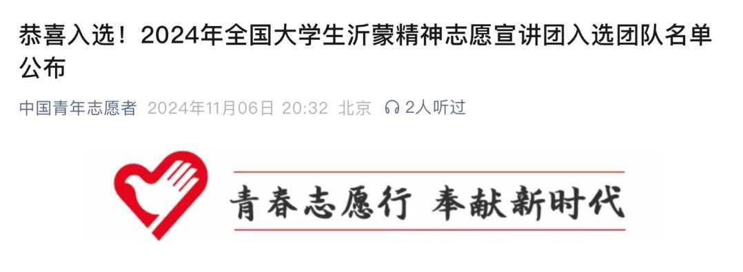 11月6日,在中国青年志愿者官方公众号公布的2024年全国老员工沂蒙精神志愿宣讲团入选团队名单中,熊猫体育“回沂”沂蒙精神志愿宣讲团成功入选!